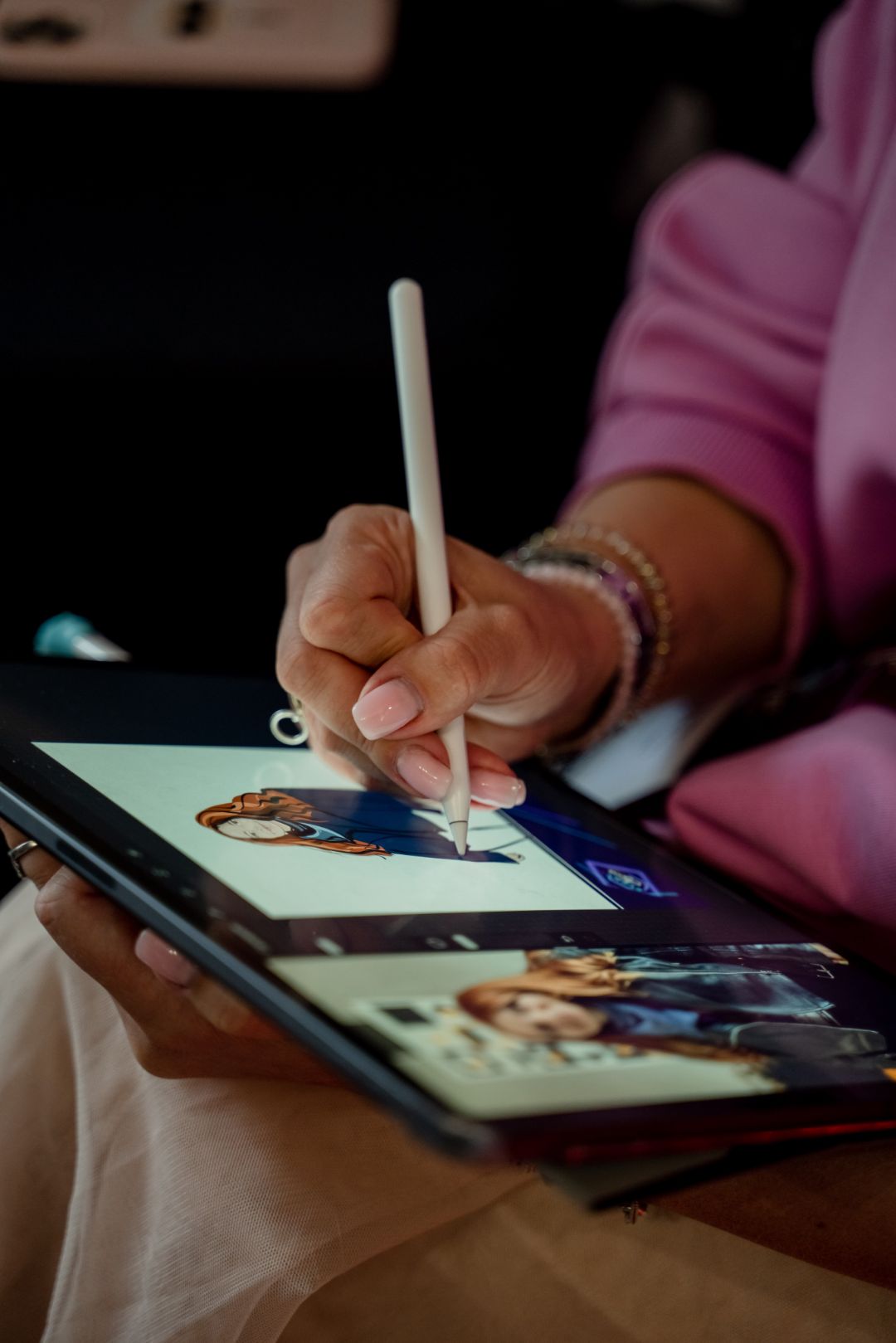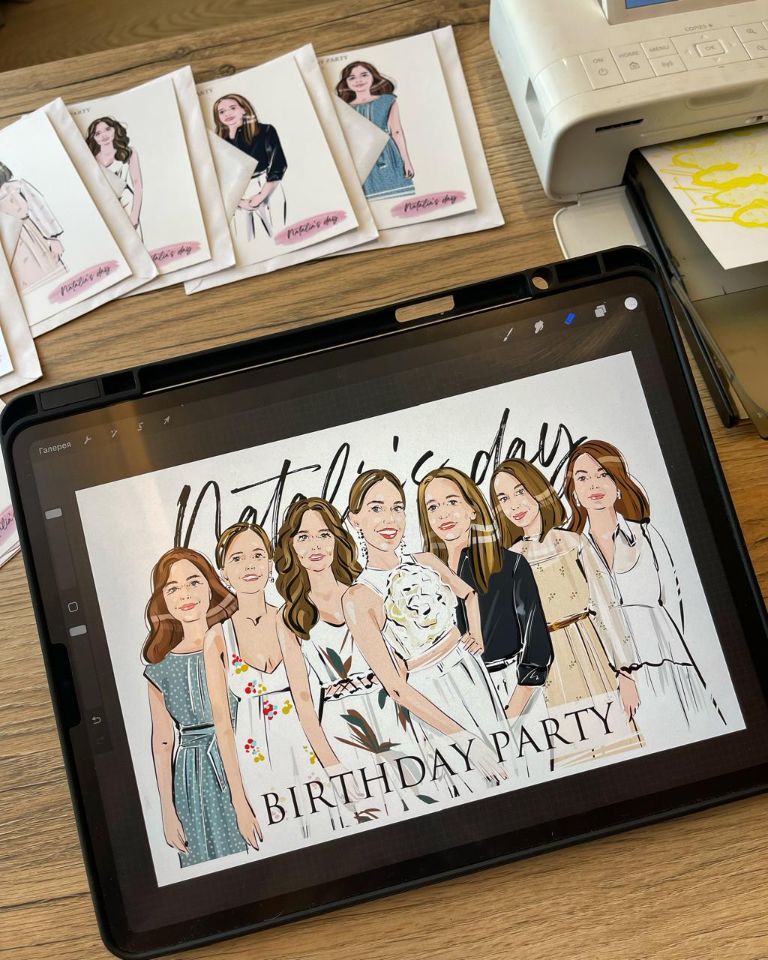 Я рисую на планшете в высоком разрешении параллельно торжеству, а готовые работы печатаю на своем принтере на фотобумаге премиум-качества.